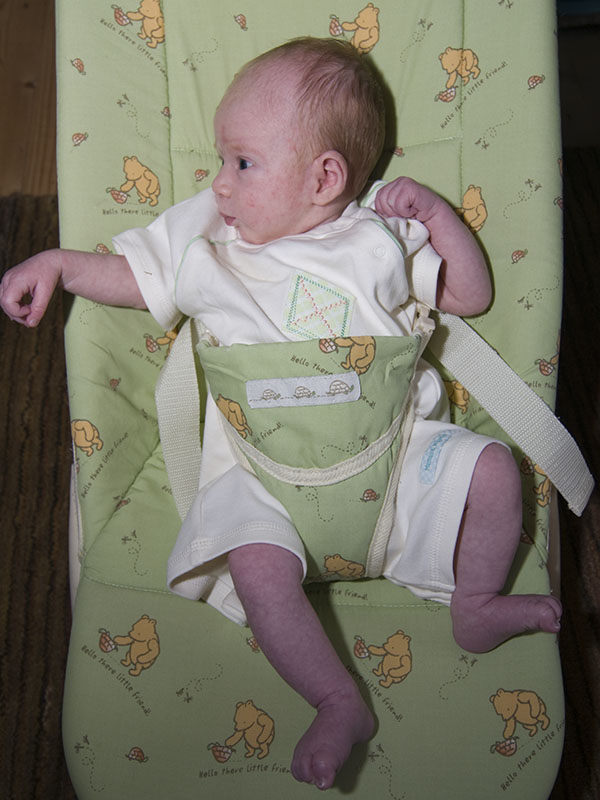 She’s now really starting to use her eyes, they are open some of the time, honest. She not only looks at you and makes eye contact, but is also starting to move her head around to keep track of you as you move. Vocalisation is coming on in leaps and bounds too with a good smattering of “Oo!” and “Gaaa” coming out. We’ve even had an accidental “hi…” and tonight a “yess”; quantum theory and discourse on the linguistic origins of Finnish will surely follow in a few months. In the mean time we’ll concentrate on smiling. That seems to be becoming well established. Mummy gets a smiley girl in the morning now. I’ve been treated this weekend too to the happy morning girl. All smiles and happy face.