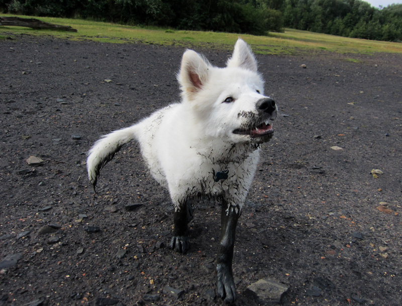 So, take one WHITE puppy who loves to run. In fact, the only thing he likes better than running is running through mud. Then go for a wander down to a nature reserve by the shore. It’s a nice walk through ground that was only returned to a semi-natural state from being a colliery a remarkably short time ago. Not far to the shore now.
